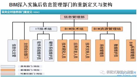 各大工程央企已陆续完成其十三五发展规划,BIM在其中基本都被提到或强调,大部分央企也已推出各自企业BIM应用实施指南,我们看看某央企指南中对BIM岗位与人才的定义。BIM深入实施后信息管理部门的重新定义与架构